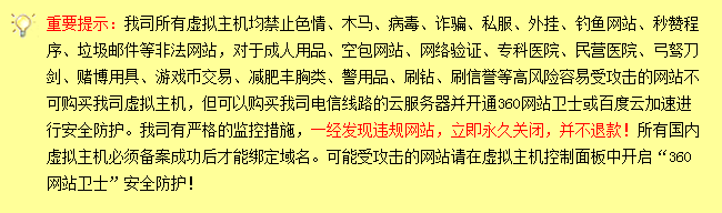 • 禁止网站内含有任何违犯国家法律法规的内容,一经发现,将立即停止网站的运行,由此引起的一切后果由空间租用者承担。